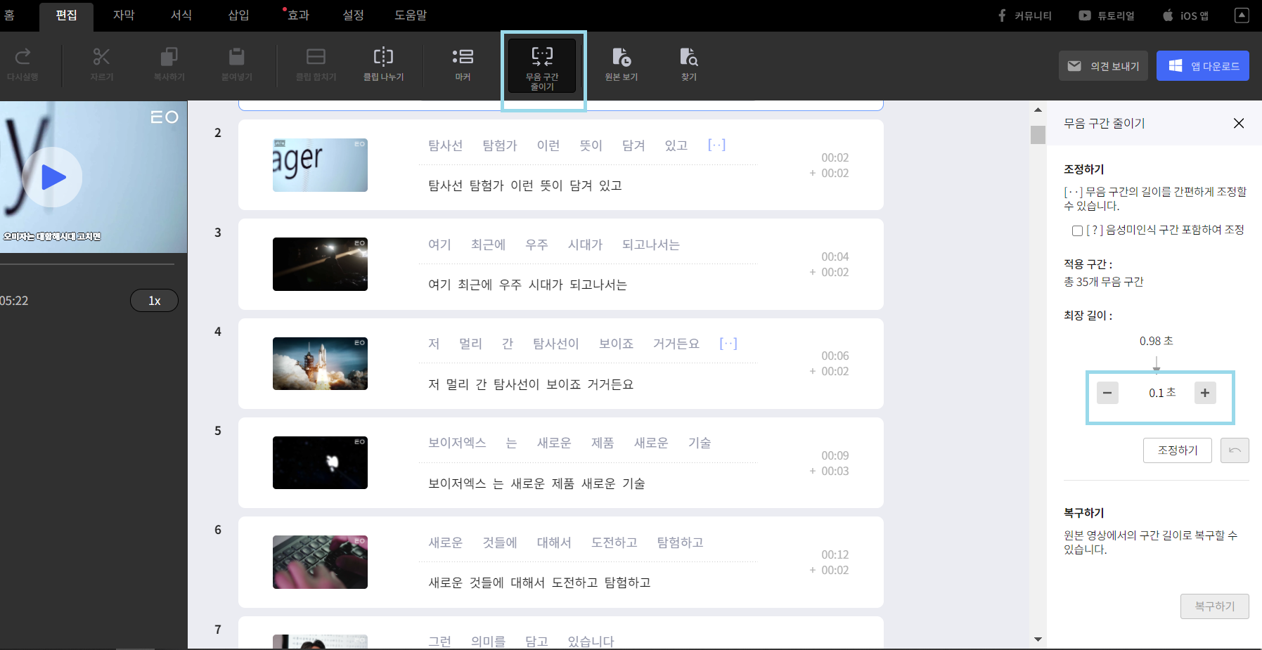 원래 5분 22초였던 영상이, 무음 구간 줄이기 기능을 누르면