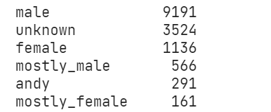 이름에 따라 성별을 다음과 같이 구분해주는데, andy는 안드로진이고 unknown은 비영어권 이름 등으로 식별할 수 없는 경우다.