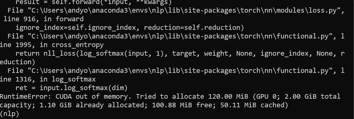 RuntimeError: CUDA out of memory. Tried to allocate 20.00 MiB (GPU 0; 2.00 GiB total capacity; 1.20 GiB already allocated; 12.88 MiB free; 32.02 MiB cached)