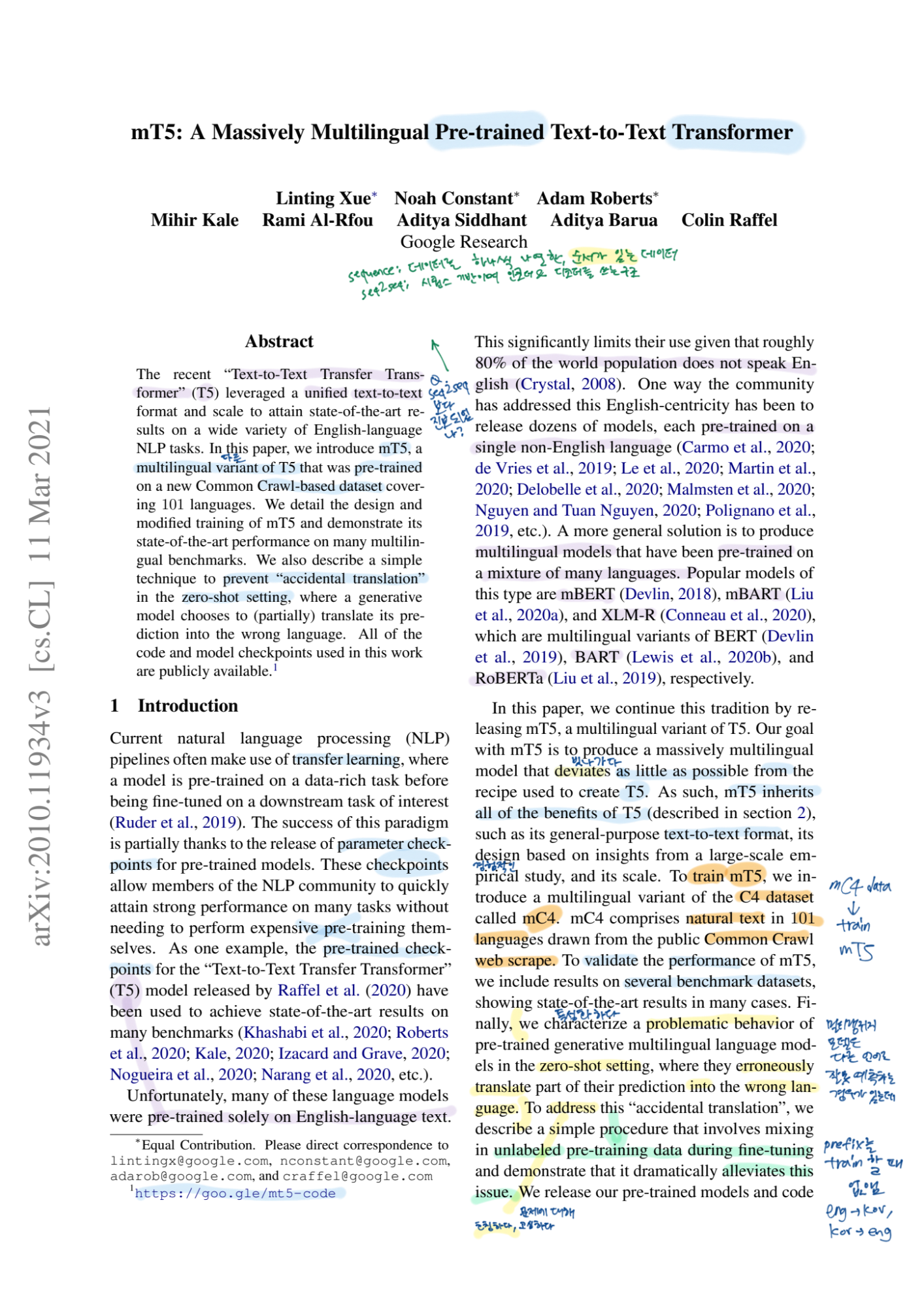 그리고 mT5에 대한 논문arxiv.org/abs/2010.11934을 꼼꼼히 읽었다.
