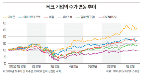 아마존의 주가 변동 추이는 다른 테크 기업보다 높은 편이다.