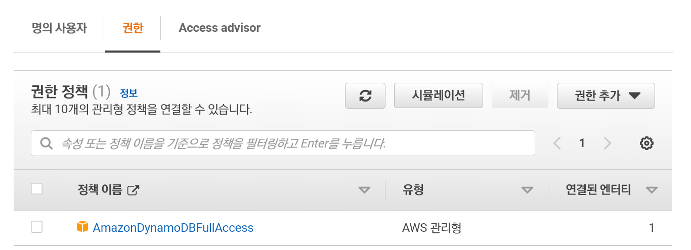 권한 추가 - DynamoDBFullAccess를 추가해 주자.