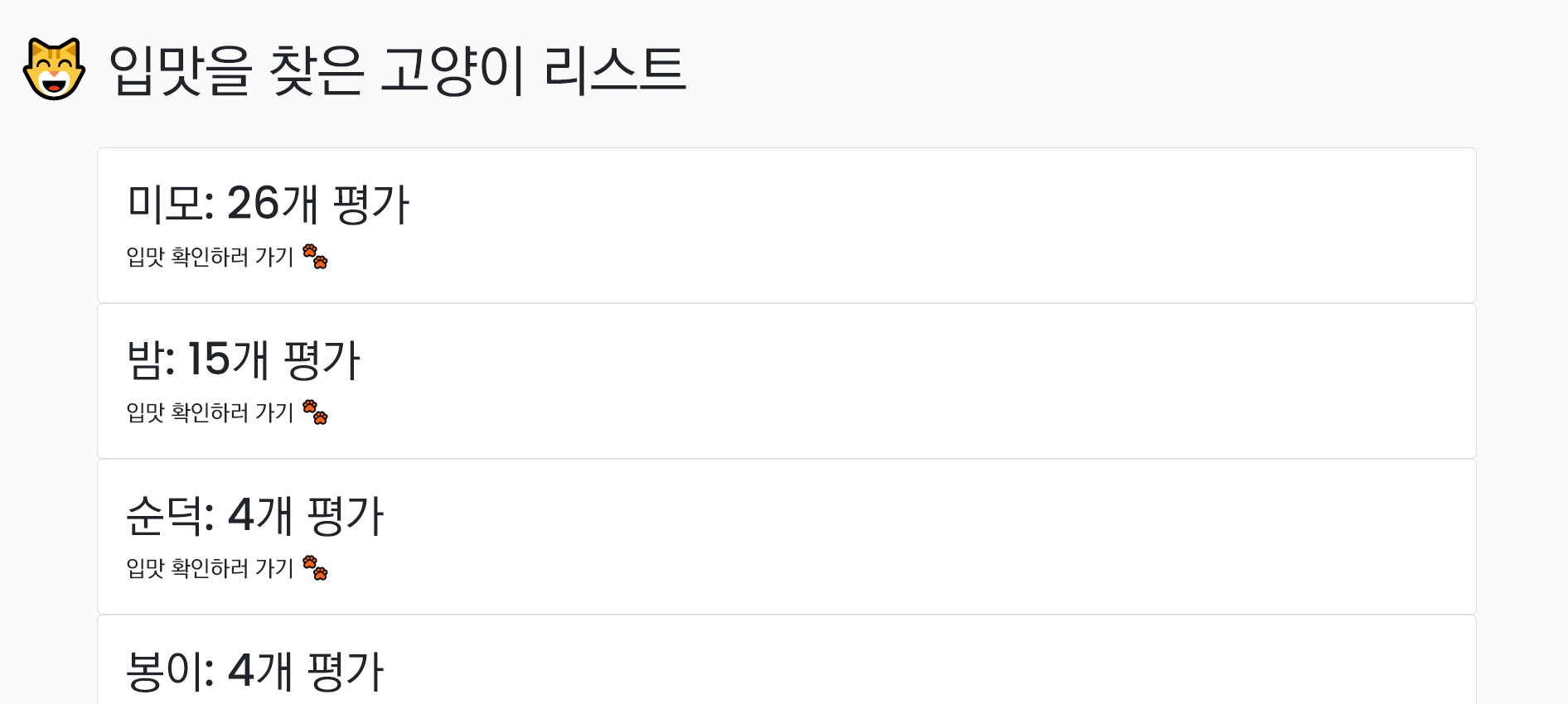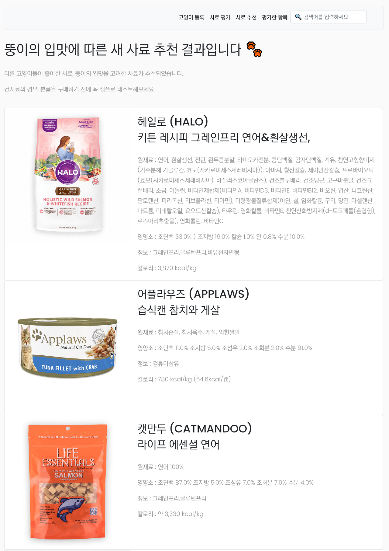평가를 하면 고양이 리스트에서 조회가 가능하다. "입맛 확인하러 가기"를 누르면 해당 고양이에게 추천된 사료가 뜬다.