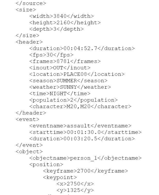 AI HUB 이상행동 탐지 데이터에 제공되는 XML (이상행동 동영상의 레이블, 시작 시간, 유지 시간, 동영상의 종료 시간, 동영상에 등장하는 행동) 파일은