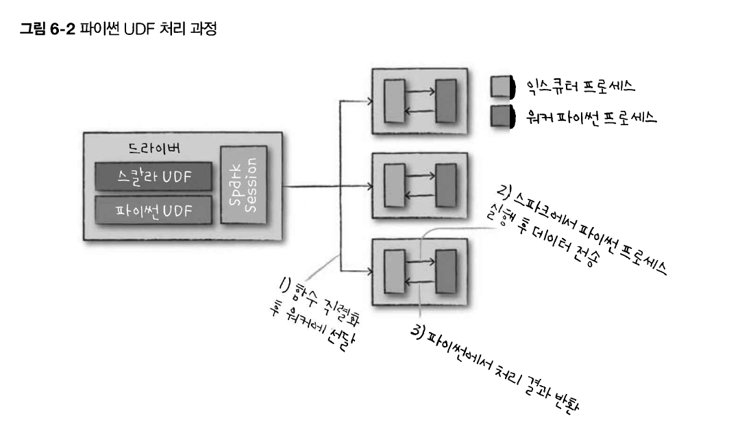 파이썬으로 함수를 작성했다면 워커 노드에 파이썬 프로세스를 실행하고, 파이썬이 이해할 수 있는 포맷으로 모든 데이터를 직렬화합니다. (자바와 스칼라에서도 마찬가지입니다.) 그리고 파이썬 프로세스에 있는 데이터의 로우마다 함수를 실행하고, 마지막으로 JVM과 스파크에 처리 결과를 반환합니다.