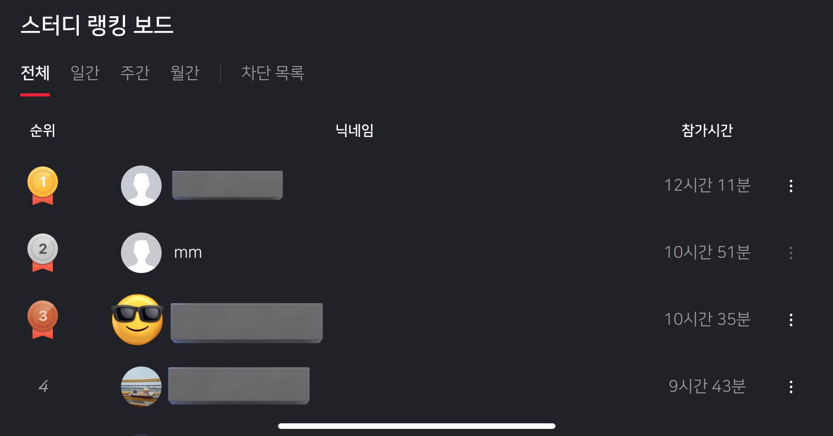 - 일일, 주간, 월간 참여 시간을 멤버별로 기록해 주며