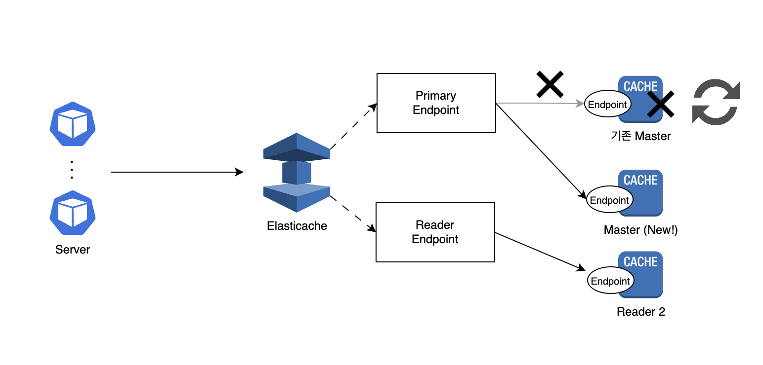 기존 마스터 노드는 업데이트가 적용되면서, 서버가 Elasticache로 요청을 보내도 해당 노드는 응답할 수 없는 상태가 된다.