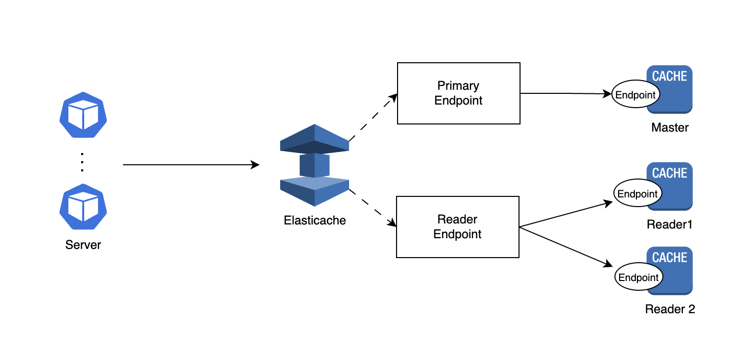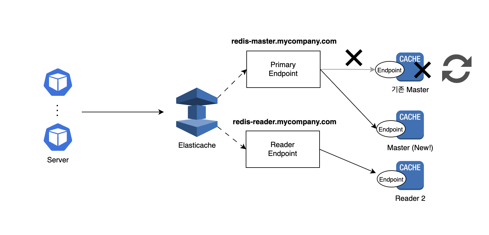 ex) 기존에 서버에서 쓰기 연산은 redis-master.mycompany.com 으로, 리더 노드에는 redis-reader.mycompany.com으로 요청