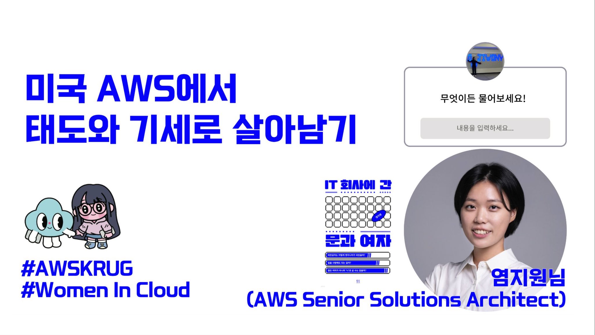 AWSKRUG Women In Cloud 모임 만들고 1년을 맞았다. 1년동안 모임 10번 열었다 ^ㅇ^ 운영진분들이 같이 열심히 모임 만들어주셔서 모임 할떄마다 힘이 난다.