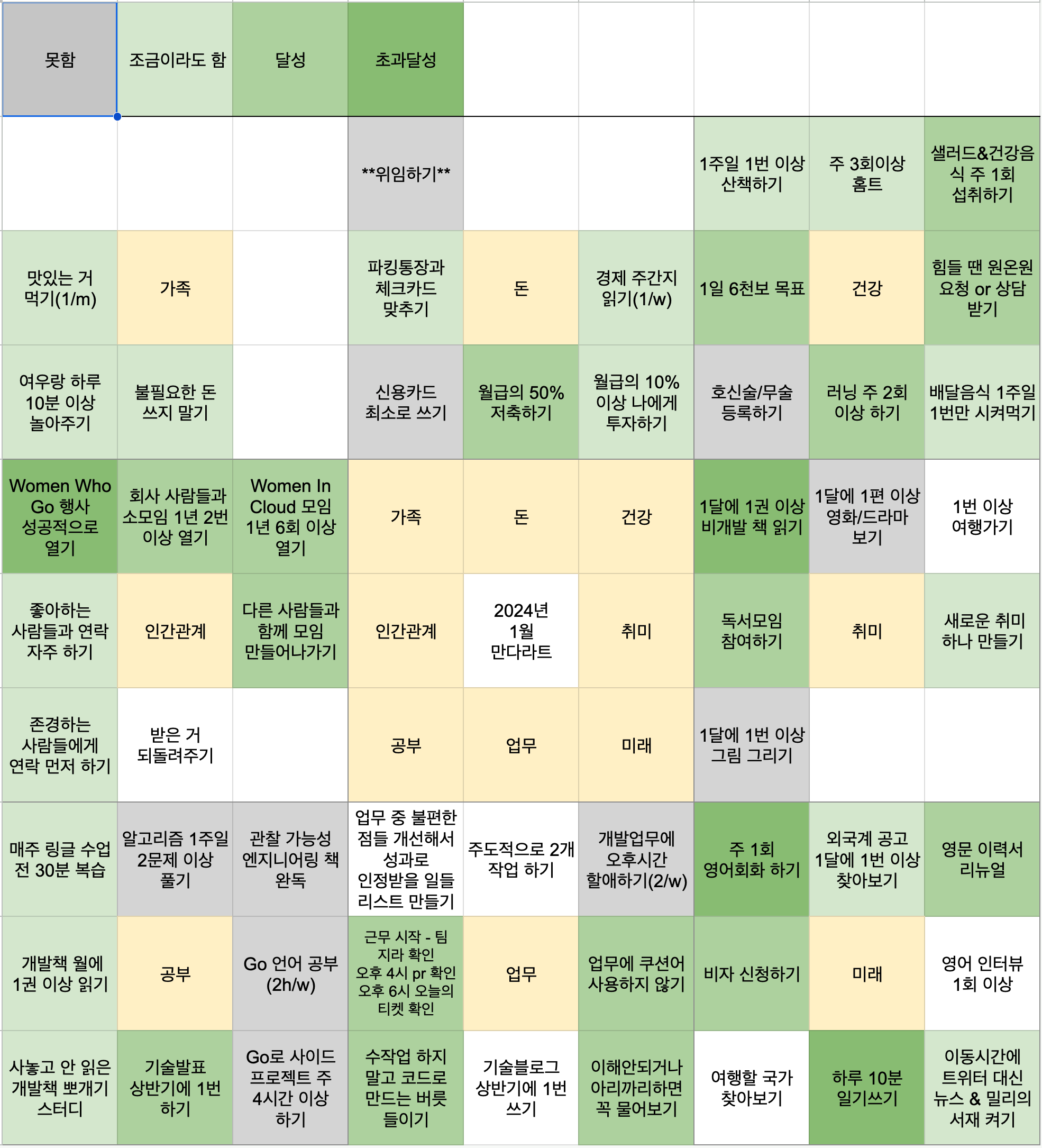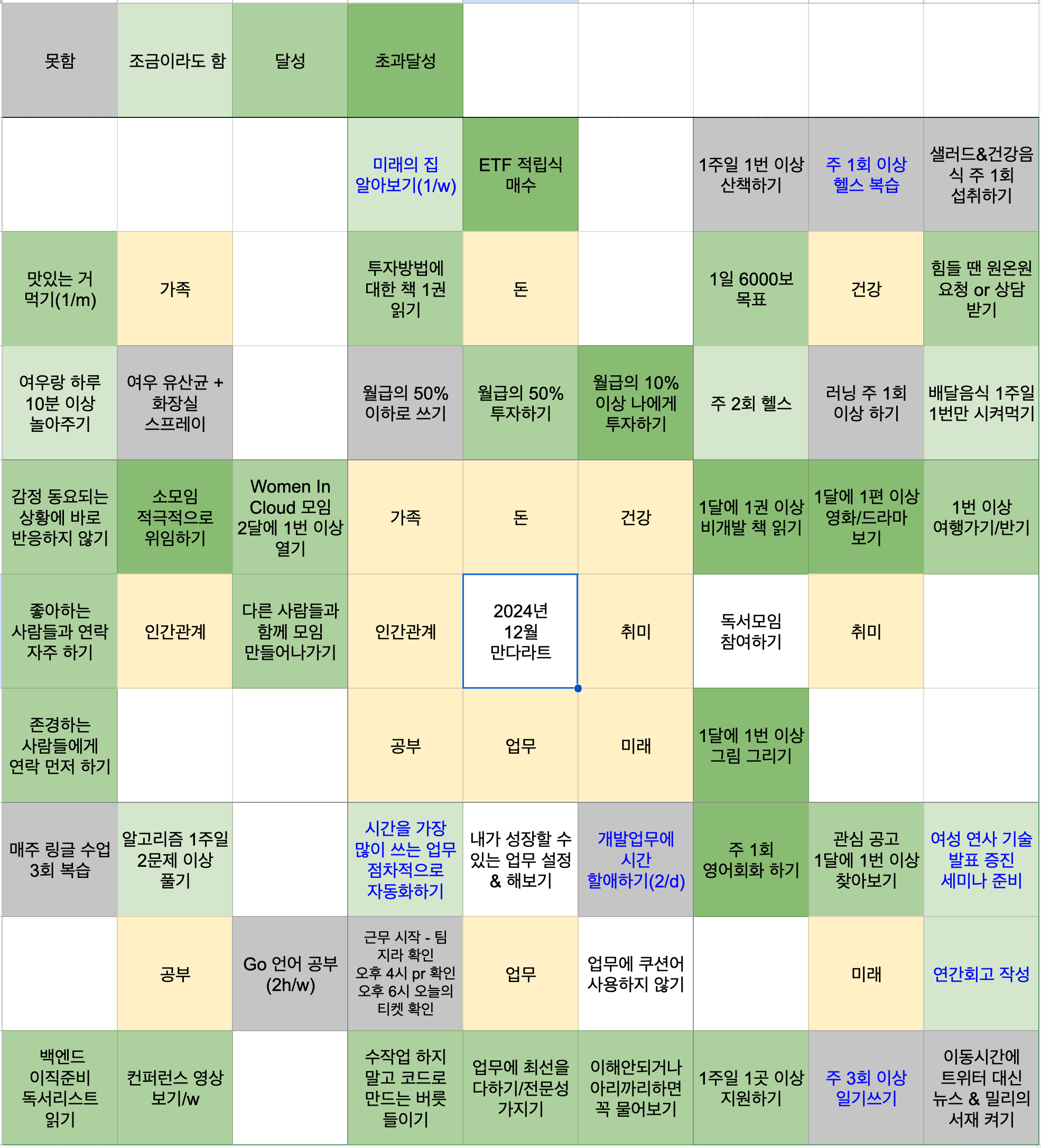 2023년부터 만다라트를 만들고 새해 계획을 세우고 있는데, 2023년에는 만다라트 작성한 것도 까먹어서 결과적으로 목표 대비 성취한 것이 많지 않다고 느껴졌다.