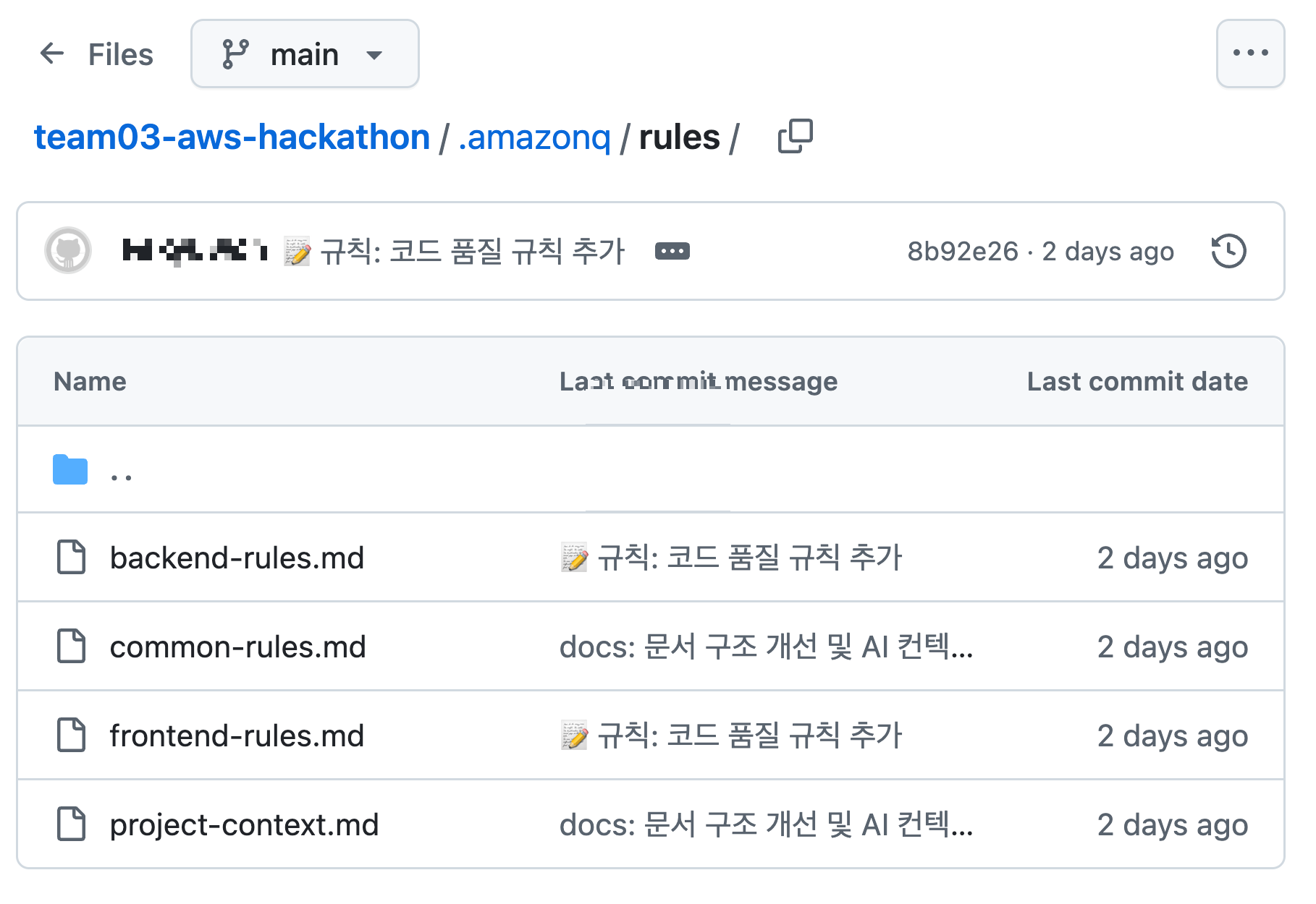 이 Rules, docs 작성을 해커톤에서 1일 차 개발을 시작하면서 가장 먼저 진행했다. Amazon Q를 적극적으로/창의적으로 활용하는 것이 심사 기준 중 가장 중요한 해커톤이니만큼, Amazon Q에게 우리의 목적과 상황, 맥락을 공유하여 문서를 생성했다.