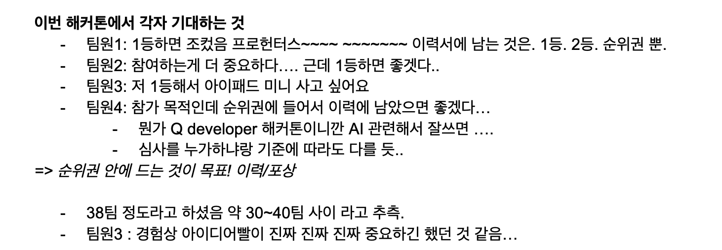 - Amazon Q 활용 방법을 어필하는 것이 심사 과정에서 핵심적이었는데, 데모/심사위원 평가에서 그걸 충분히 잘 어필하지 못했다는 생각이 든다.