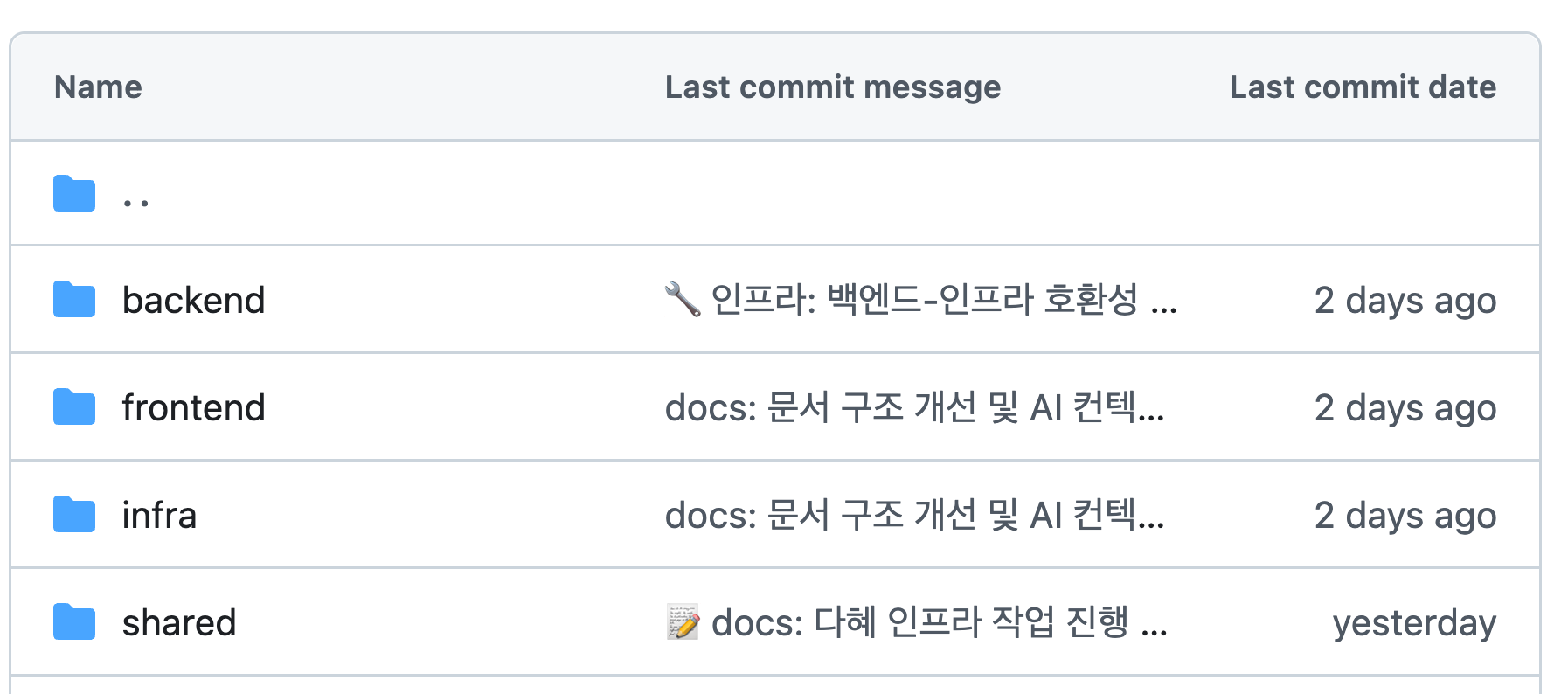 - docs : 사람 작업자를 위한 공용 규칙 문서 용으로 디렉토리를 구분했다. (api 스펙, DB 스키마 등)
