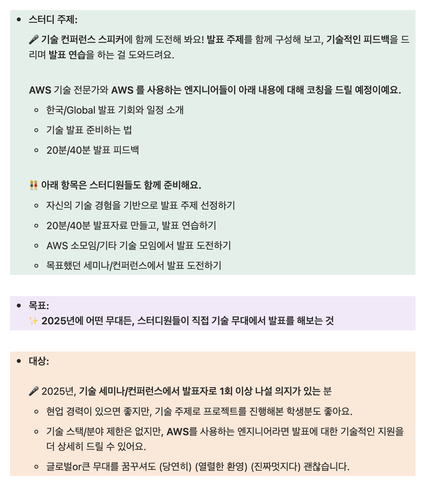 스터디에 대한 결산을 해보자면, 11명의 스터디원 중 6명 이상이 2025년에 1군데 이상의 발표 무대에 나선 것으로 알고 있다.