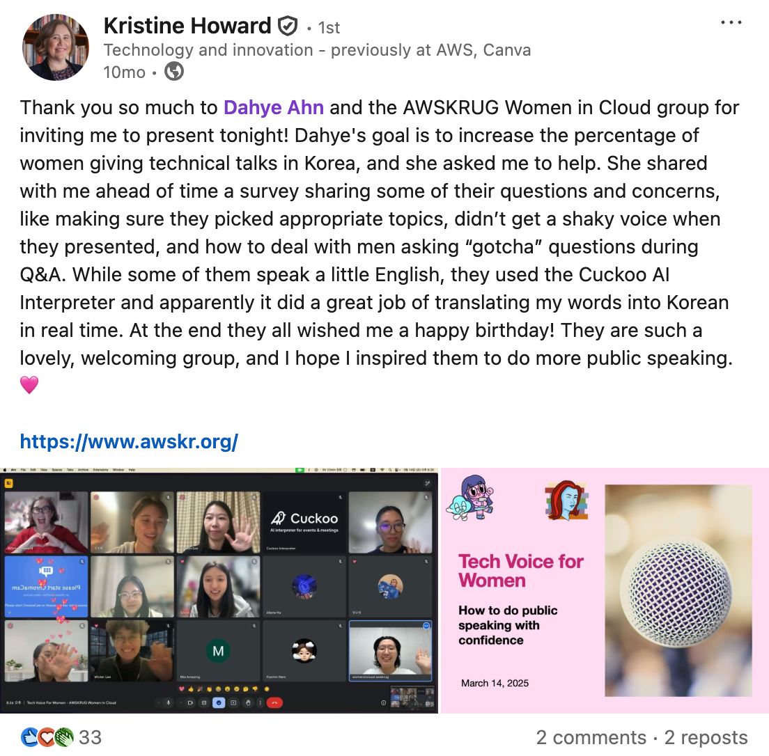 AWS 전 DevRel 이신 Kristine 에게 이 고민을 말했더니, "여성 엔지니어들에게 기술 발표에 대한 교육 세션을 제공하면 어떨까?"라는 아이디어를 주셨다.