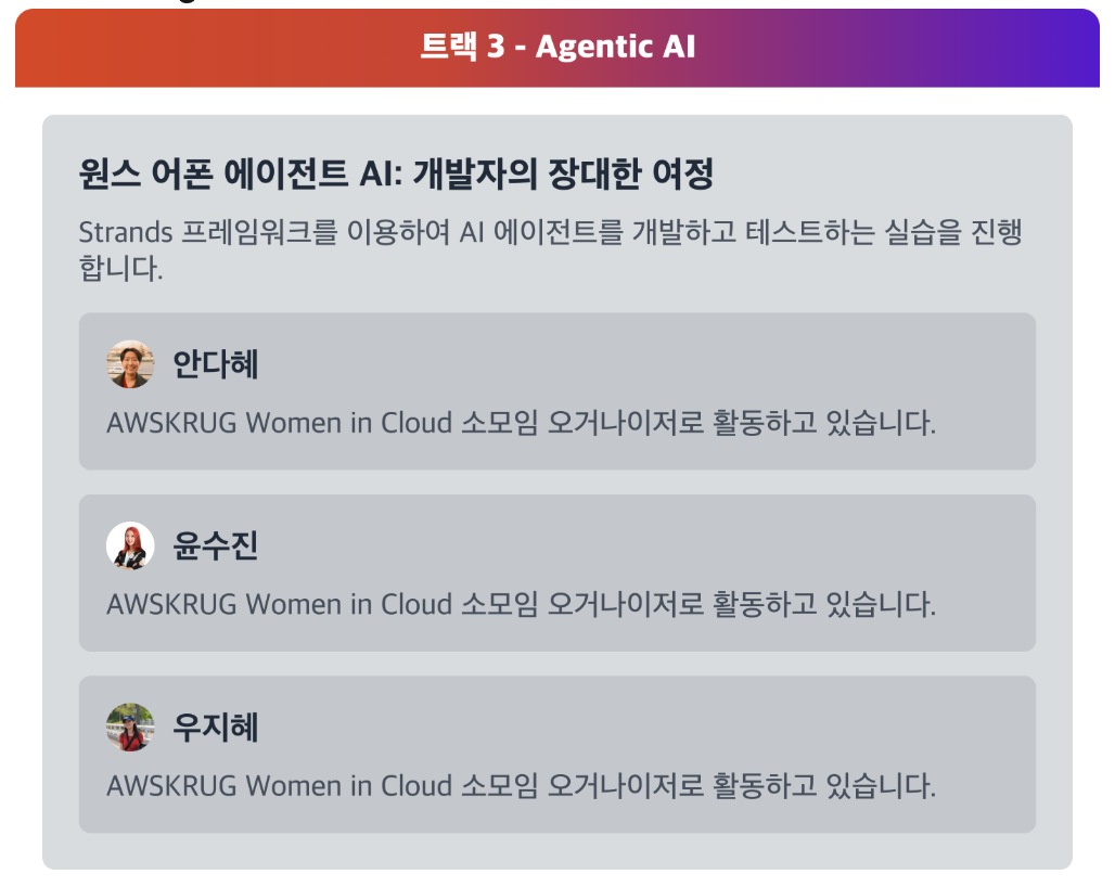 AWSKRUG Women In Cloud 운영진 분들과 AWS Community Day에서 핸즈온 세션 하나를 맡았다.