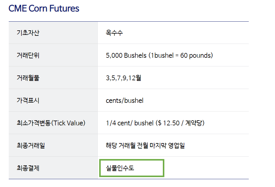 신한의 옥수수 선물상품인데, 최종결제가 "실물인수도" 라고 되어 있다.