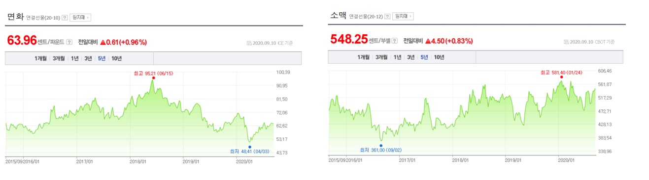 면화와 소맥의 경우 5년 차트로 봤을 때, 면화는 메리트 있는 투자 대상은 아니고 소맥은 가격이 들쭉날쭉하니 쌀 때 사서 비쌀 때 팔면 수익은 얻을 수 있겠다.