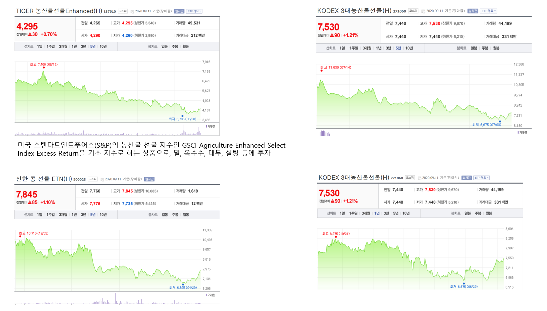다음은 국내에서 거래되는 농산물 선물 ETF, ETN이다.