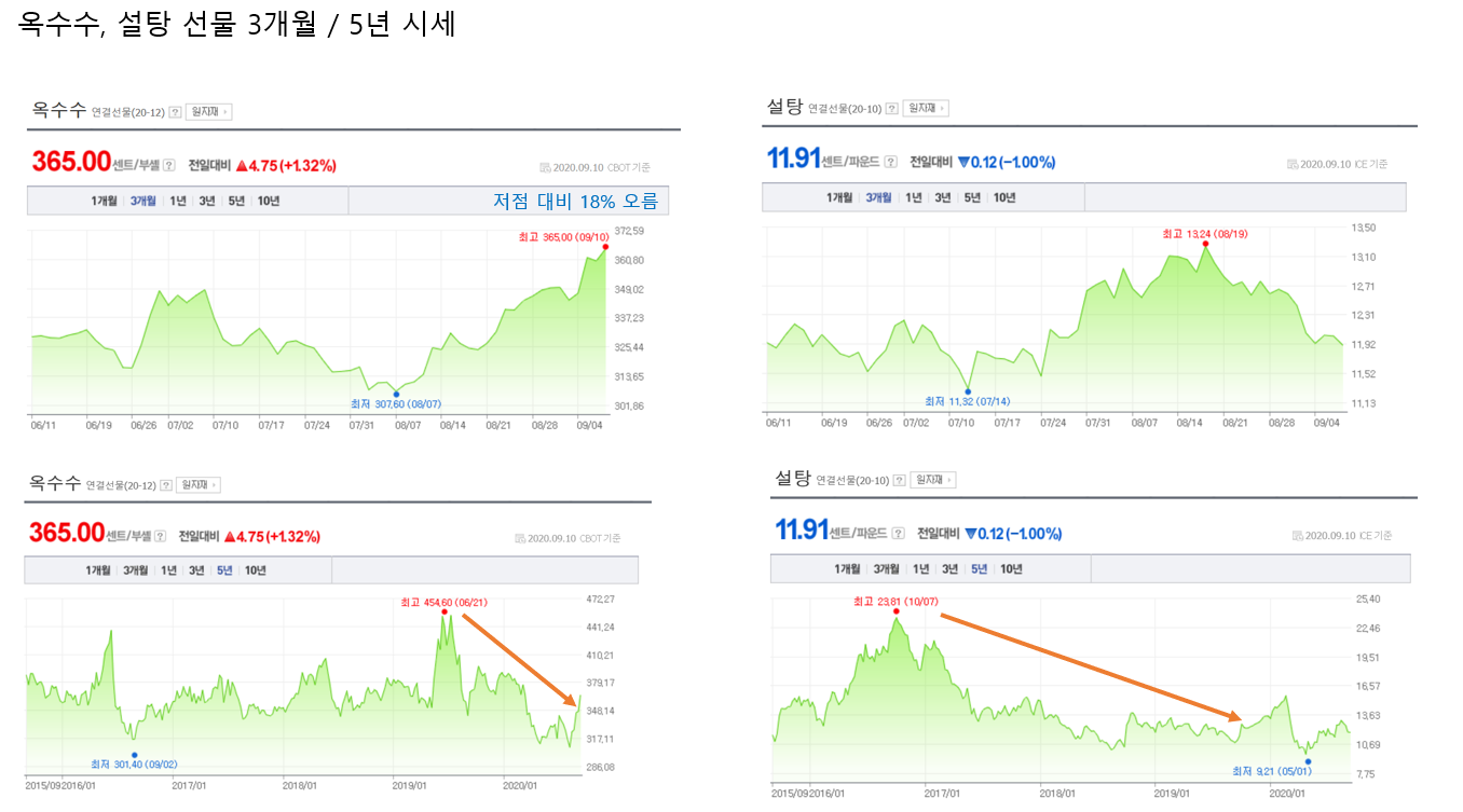 옥수수는 8월부터 가격이 상승세이나, 최근 1년간은 가격이 하락세이다.