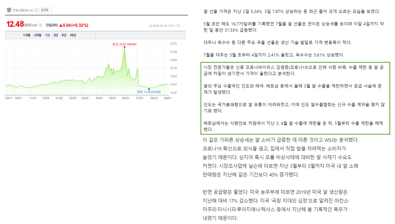 쌀 선물의 경우, 코로나19 사태로 3월부터 가격이 올라 6월에 피크를 찍었으나, 수출 제한이 하락되고 수급이 완화되면서 가격이 내렸다.