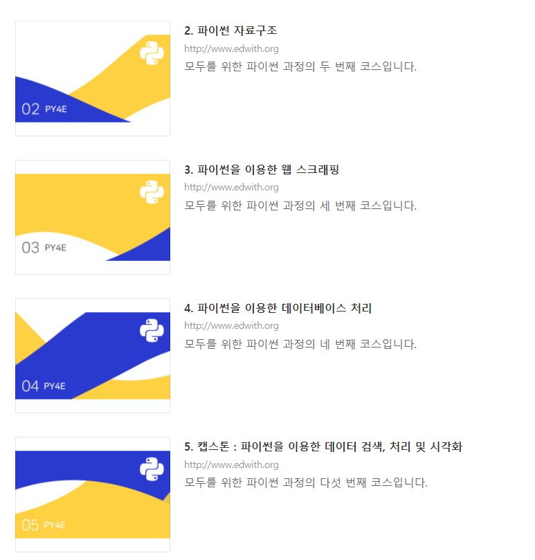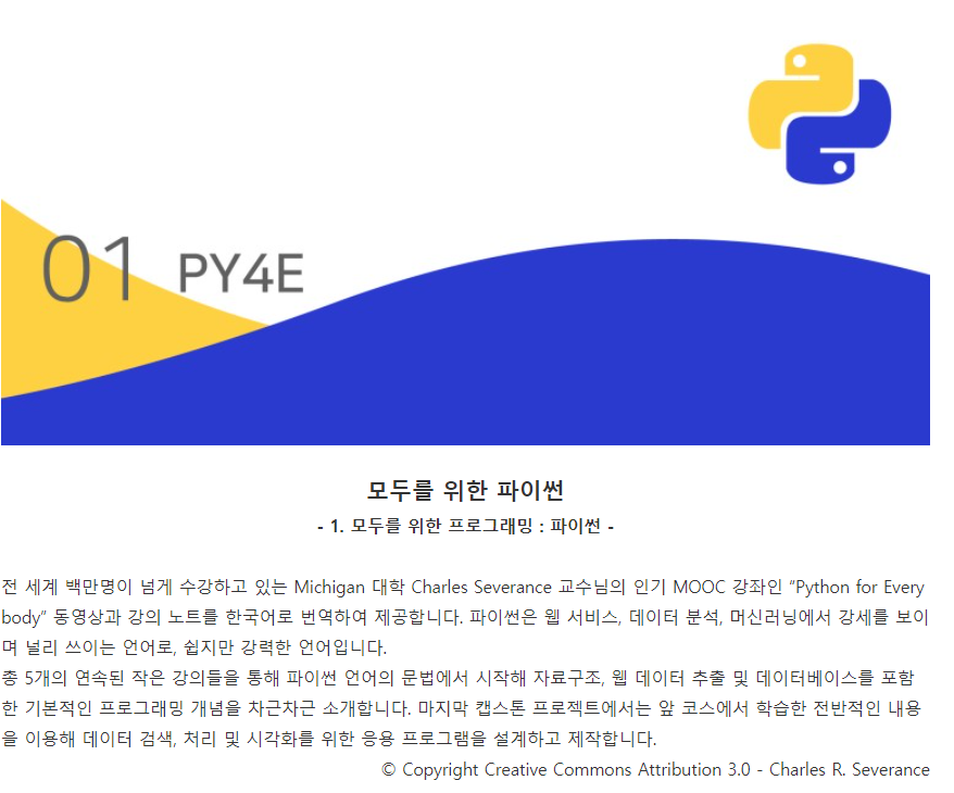 Cousera의 Python for everybody를 네이버 커넥트 재단에서 번역해 무료로 제공하고 있다.