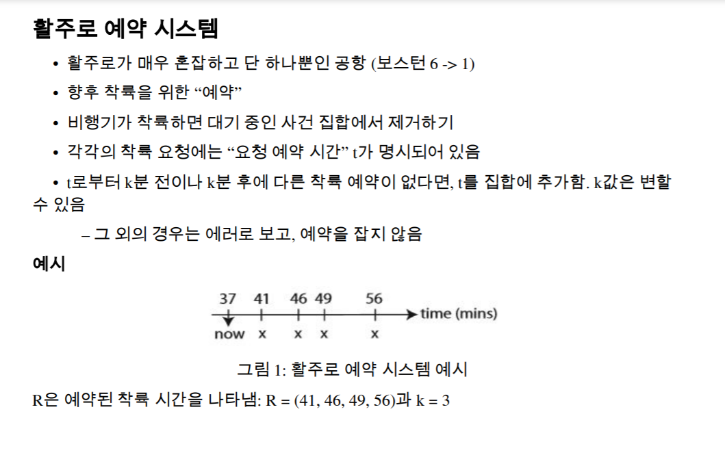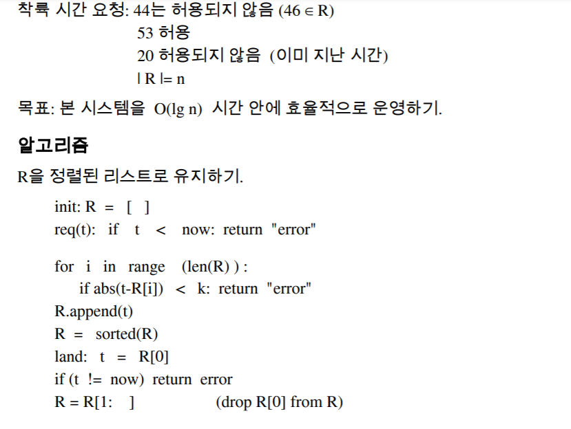 R : 착륙 시간의 집합이다. (시간 t로부터 k분 안에 다른 착륙 스케줄이 없다면.)