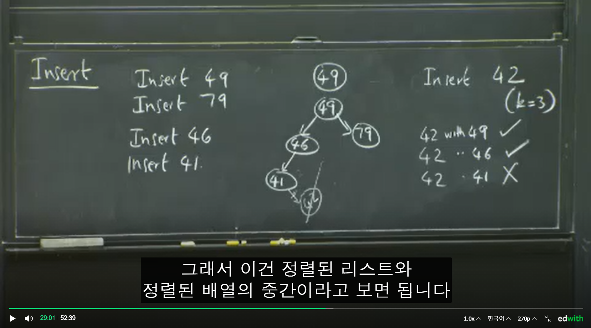 네이버 AI 부스트캠프에서 필요한 사전 지식에 '이진탐색트리'가 있어 네이버 edwith에 검색해 본 결과 이 강의를 찾을 수 있었다. 5강인 이 강의만 들어본 후기로는 매우 만족스럽고, 다음 강의는 물론이고 이전 강의들까지 다 듣고 싶다.