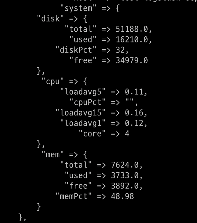 { \"system\": { \"cpu\": { \"core\":4, \"cpuPct\":, \"loadavg1\":0.18, \"loadavg5\":0.23, \"loadavg15\":0.25 }, \"mem\": { \"total\":7624.00, \"used\":3731.00, \"free\":3894.00, \"memPct\":48.94 }, \"disk\": { \"total\":51188.00, \"used\":16209.00, \"free\":34980.00, \"diskPct\":32 } }