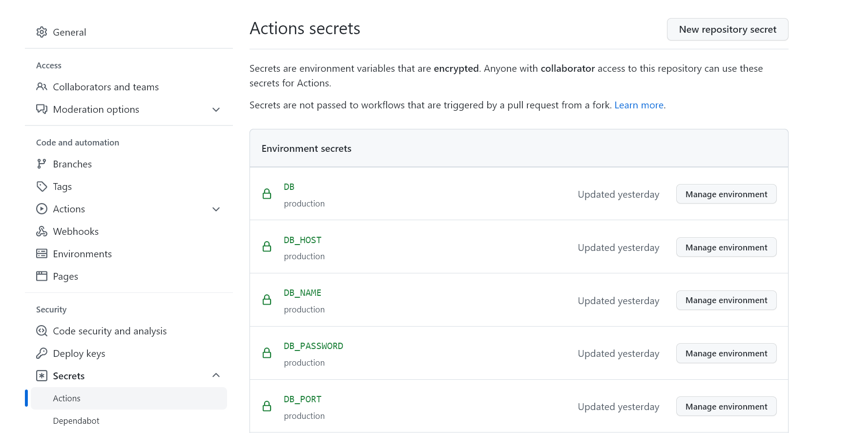 .env 파일은 깃허브에 올리지 않기 때문에 깃헙 액션에서 빌드-배포를 할때 변수 값을 Github Actions Secrets 사용해 넣어주고