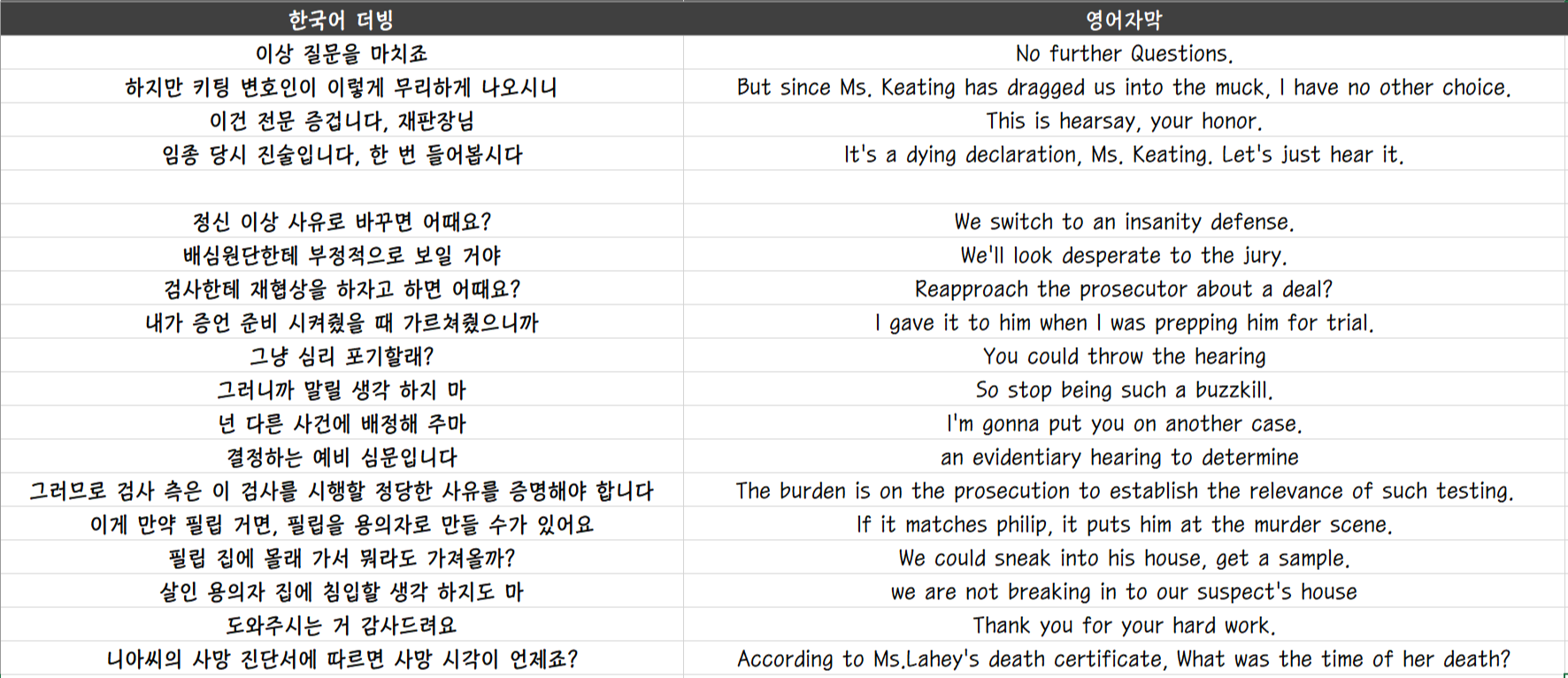 평소에 한국 법정 드라마나, 법정 관련 다큐멘터리, 혹은 법정 관련 자료를 꾸준히 팔로업하지 않으면 실제 사람이 말하는 것처럼 번역하기 힘들 것 같다.